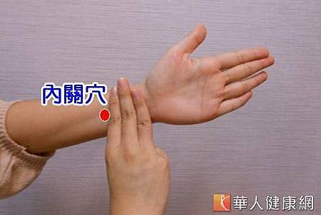 內關穴:位於前臂內側,手腕橫紋上方2寸、約3橫指距離處,介於尺骨和橈骨中間,手握拳時可明顯看到兩筋凹陷的地方。內關穴位於經絡樞紐交會處,對側按壓可緩解因上火所引起的牙痛、牙齦紅腫、發熱。此穴另有鎮靜神經、強心定喘、止吐、治咳嗽等作用。